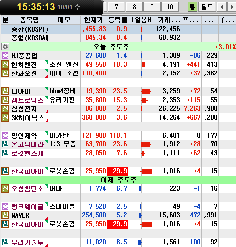 연휴 전이라 그런가 시장이 정말 심심하네요. 지수만 잘 올라가고 뭐하나 재미있는 종목이 없네요. 내일은 연휴전 마지막 거래일이고 미국 벙부 셧다운 어쩌고 이슈도 많은 것 같아 매매는 살살해야겠습니다.