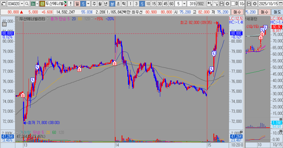 로보스타는 왠지 맘에 안 들어서 상따는 안 들어갔었는데요. 상한가를 다 먹고 떨어지길래 SF존에 매수를 걸었습니다. 어차피 오늘 주도주라 떨어지면 종베 해야겠다 생각했습니다. 종베시간이 왔는데 sf존 근처네요. 종베 진입했고요. 처음 Sf존에서 매수했던 물량은 상한가 2 틱아래에 매도 걸어 두었었는데 상한가 들어가면서 매도되었습니다. 종베 들어갔던 물량만 들고 넘어왔는데요. 프리장에서 두산에너빌리티 보고 있느라 힘들어서 시초가 갭이 뜨는 것 같아서 전량 매도 하였습니다. +5.2% 수익 마감입니다.
