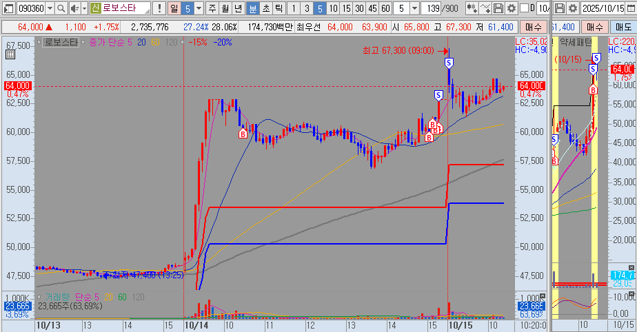 이번주 들어서 로봇섹터가 엄청난 강세네요. 케이엔알시스템은 오전에 상한가 들어간 다음에 계속 풀려서 sf존에서 잡아봐야겠다 했는데 아슬아슬하게 안 오고 상한가 닫아 버렸네요. 상따 할걸 그랬네요 ㅠㅠ 삼전 하닉이 엄청나게 오르면서 지수가가 많이 올랐습니다. 삼성바이오가 밝은 실정전망 리포트 빨로 급등 하였네요.