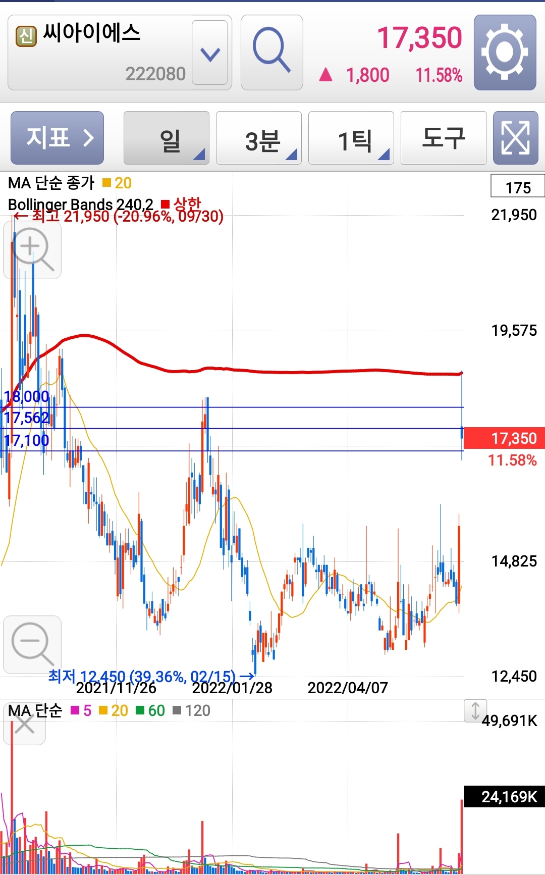씨에스아이는 움직임이 생각보다 많이 느린 종목이라 기다리기 조금 편했네요.