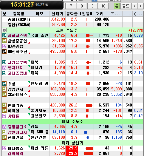 오늘은 조선이 돌아왔습니다. 그리고 삼전하닉이 미친 듯이 오르면서 반도체가 여전히 좋네요. 트럼프형이 아시아 순방을 하면서 대북주들이 꿈틀대고 있는 모습이네요.