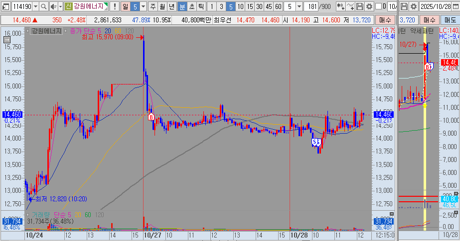 강원에너지는 전일상한가다음에 +6% 정도 오르고 바로 쭉 밀려서 38 스윙 관점으로 매수하였습니다. 어제 지지부진해서 하루 더 보기로 했고요. 오늘 10시 손절하였습니다. 38 스윙은 2차 매수까지 너무 멀어서 1차만 매수하고 전저점 깨질 때 손절 하였는데 손절하고 나니 급등해서 본탈 기회를 줬었네요. -4.6% 손실 마감입니다.