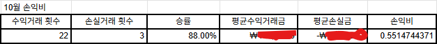 10월은 감사하게도 수익으로 마감하였습니다. 월마다 그달의 매매형태와 통계를 내봐야겠습니다.