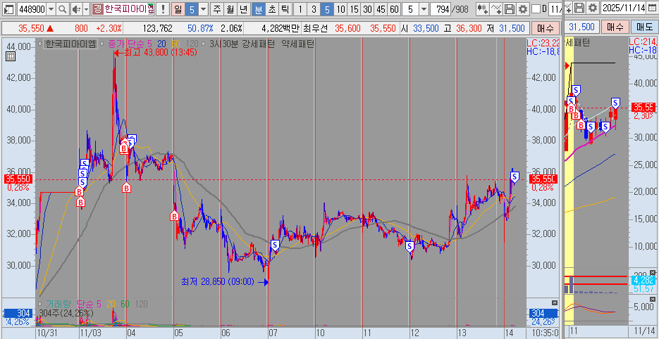한국피아이엠은 지난 11월 3일에 전상매매로 잘 먹고, 다음날 피뢰침 매매로 진입하였습니다. 거래대금이 상한가날의 두 배정도 터지고 오후에 돈도 들어오고 여러 가지로 정말 좋다 생각하고 진입하였습니다. 다음날 갭하락 출발에 계속 밀려서 전저점 부근에서 추가 매수를 하였습니다. 그리고 반등 나올 때 절반 본탈 하고 물량 절반은 그대로 물려 버렸습니다. 다음날 급락 나올 때 B2에서 추가매수를 하였습니다. 그리고 계속 밀리네요. 며칠 동안 물려서 마음고생을 많이 하다가 오늘 아침 하락 vi가 걸려서 완전 멘붕이 왔었네요. 그래서 다른 종목도 대충 매매하고 이걸 어쩌나 고민 고민 하다가 그냥 10시에 던지자 하고 기다리고 있는데 또 급등이 나오네요. 상승 vi까지 걸려서 거의 본전 부근까지 다시 왔더라고요. 그래서 전량 매도하였습니다. 최종 -5.58% 손실 마감입니다. 여러번 추가매수를 해서 손실금이 크네요. 그리고 이놈 때문에 그린생명과학을 제대로 신경 못써서 그냥 본탈로 끝내 버렸네요. 다시는 이렇게 처물려서 질질 끌려다니지 말아야겠습니다. 피뢰침종배한 다음날 10시에 나머지 절반을 깔끔하게 털어 버렸어야 했었습니다. 다시는 같은 실수를 반복하지 말아야겠습니다.