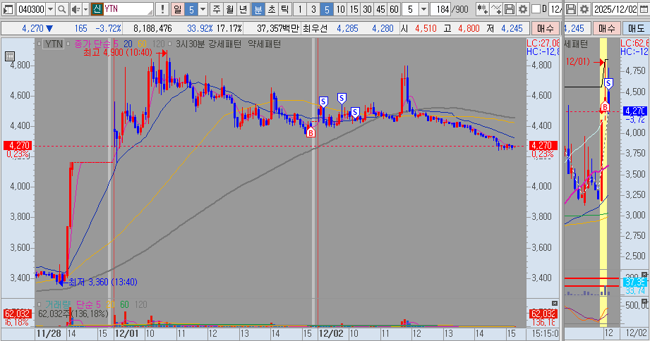 YTN도 피뢰침 종배 하였습니다. 상한가 다음날 거래대금 천억터져주고 안타~ 후에 잘 밀려서 종가에 매수하였습니다. 피뢰침 라인까지 밀리지 않아서 절반만 매수했고요. 아침에 삼양바 때문에 손을 덜덜 떨고 있느라 이놈은 대충 3 퍼 보이면 매도매도 하였습니다. +2.83% 수익 마감하였고요. 12시쯤 슈팅이 한번 있깄했었네요. 나중에 슈팅이야 있을지 없을지 모르니 잘 팔았습니다.