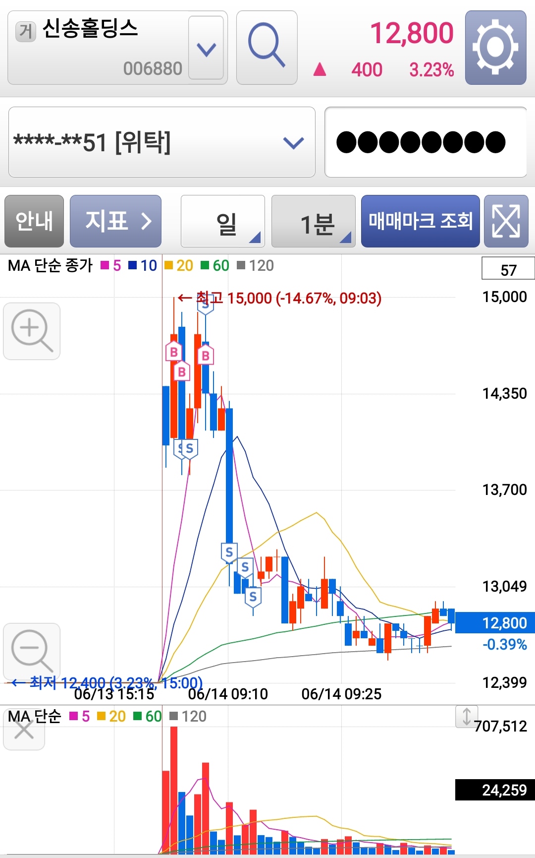 15,000원 돌파를 보고 진입을 시작했는데 빠지면 진입을 멈춰야 하는데, 금방 마음을 바꿔서 기준종 매매로 가자~ 하고 계속 매수를 진행했다는 것입니다.