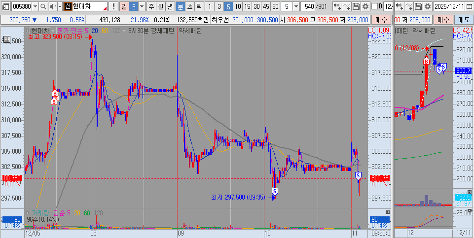 현대차 지난주 5일에 주도주 종배 하였습니다. 거래대금 2조 넘게 터지고 하루 종일 움직임이 좋았네요. 야시장 추가매수는 조건이 되지 않아 매수하지 않았습니다. 다음날 프리장에 +2% 정도에 탈출할 기회가 있었지만 내가 이거 먹으려고 현대차를 매수한 게 아니다 하고 버티다기 이 꼬락서니가 나고 말았네요. 어제 전저점 깨지면 절반 손절해야겠다 하고 좀 넉넉하게 자동 손절을 걸어 놨는데요. 손절 나가고 보니까 딱!!!! F존 자리였더라고요 ㅠㅠ F존 반등도 잘 나왔고요. 오늘 아침에 전에 잡았던 저점자리를 못 지켜 줘서 전량 매도 하였습니다. -4.86% 손절입니다. 대형주를 배팅할 때는 차라리 비중 배팅을 해서 수익금 게임을 하는 게 맞는 것 같습니다. 종배와 같은 비중으로 들어갔더니 +2% 매도에 손이 안 나가더라고요.
