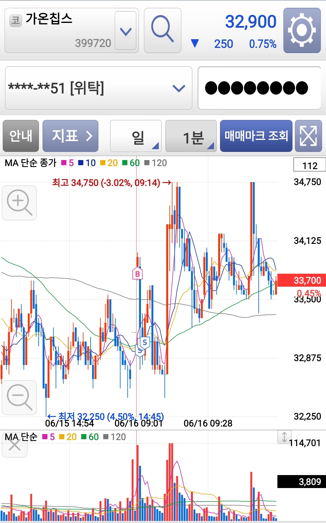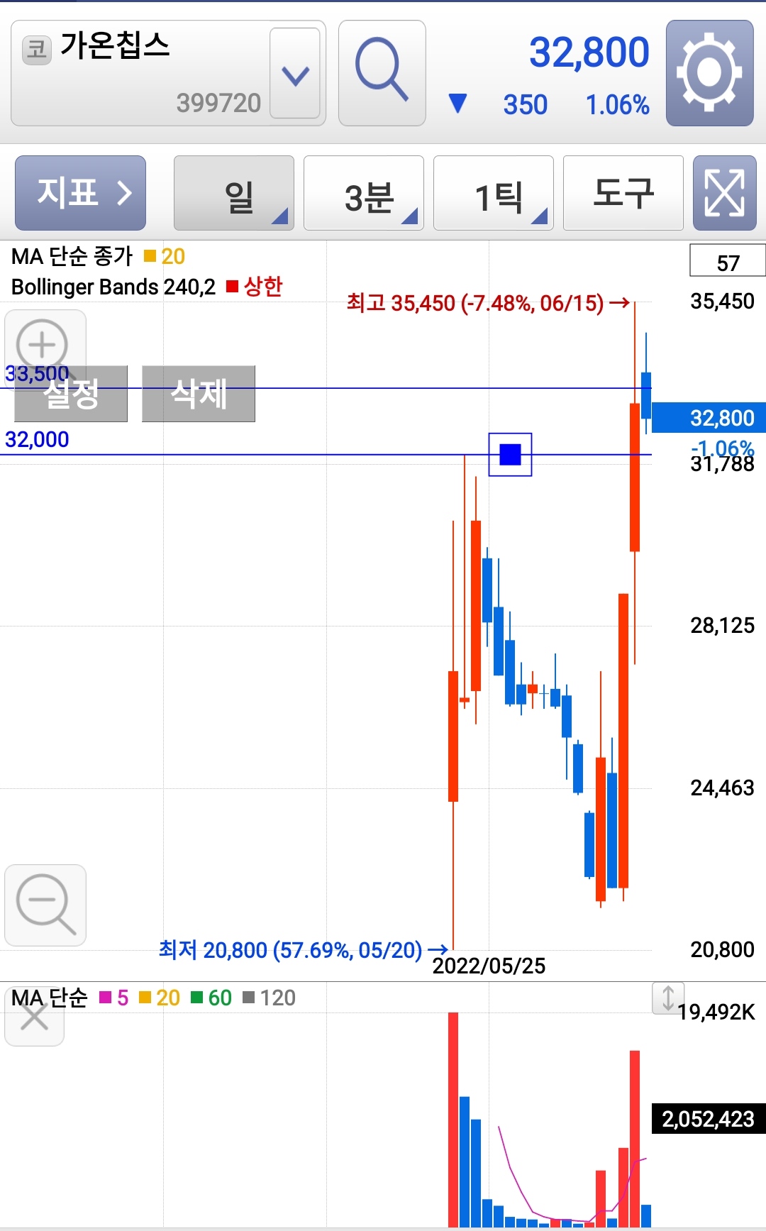 관심종목이었던 가온칩스는 상단선 33,500위에서 시가가 형성되어 시가 배팅 진입했습니다.