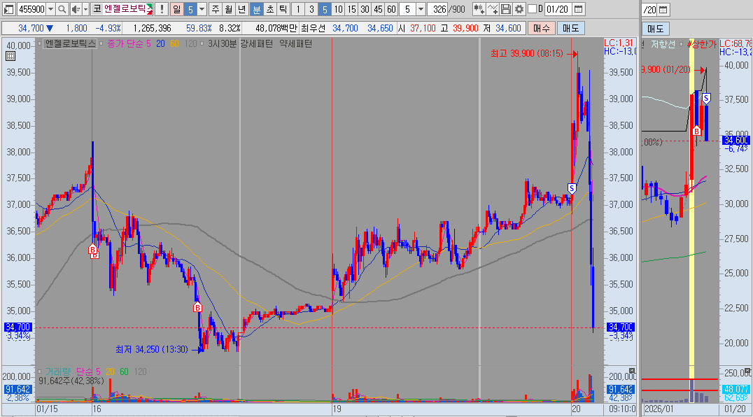 오늘은 지난 16일에 골드존 진입했던 엔젤로보틱스를 매도하였습니다. 2차까지 매수가 되었고요. 여행 중이라 자동감시주문을 걸어 놨는데 야시장에는 주문이 안 나가는지 어제 매도가 안되었더라고요. 그래서 오늘 장초밤에 바로 팔아서 +3.86% 수익마감하였습니다. 그리고 엄청 올라서 약간 배가 아팠었는데 겁나게 내려 꽃네요. 이거 운전수가 성질 정말 더러운 놈인가 보네요.
