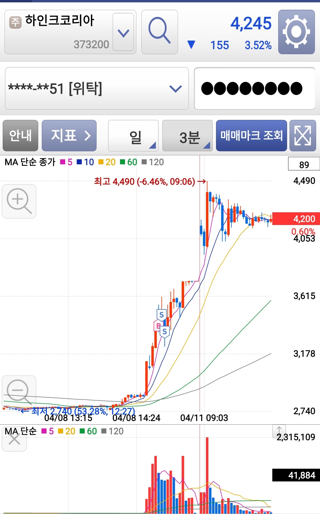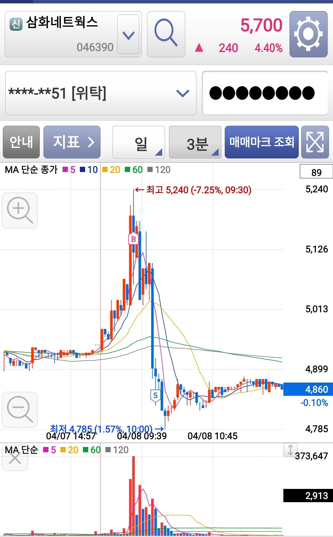 삼화네트웍스 장중 단타조건식에 걸려서 기준봉 중간 위쯤에서 잘 진입했다.