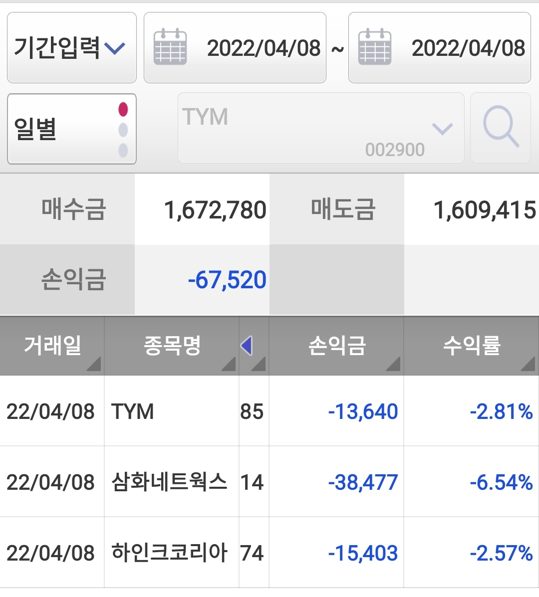 장중 매매를 안 하는 게 좋을 것 같기도 하지만 나름 일봉도 잘 확인하고 진입했는데 결과가 정말 처참하네요.