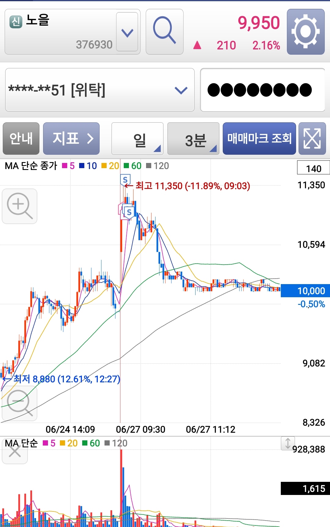 위니아에이드는 시가 배팅 들어가서 그럭저럭 잘 먹고 나왔는데, 노을을 기준봉 매매로 들어갔다가 깨져서 손실로 마감했네요.