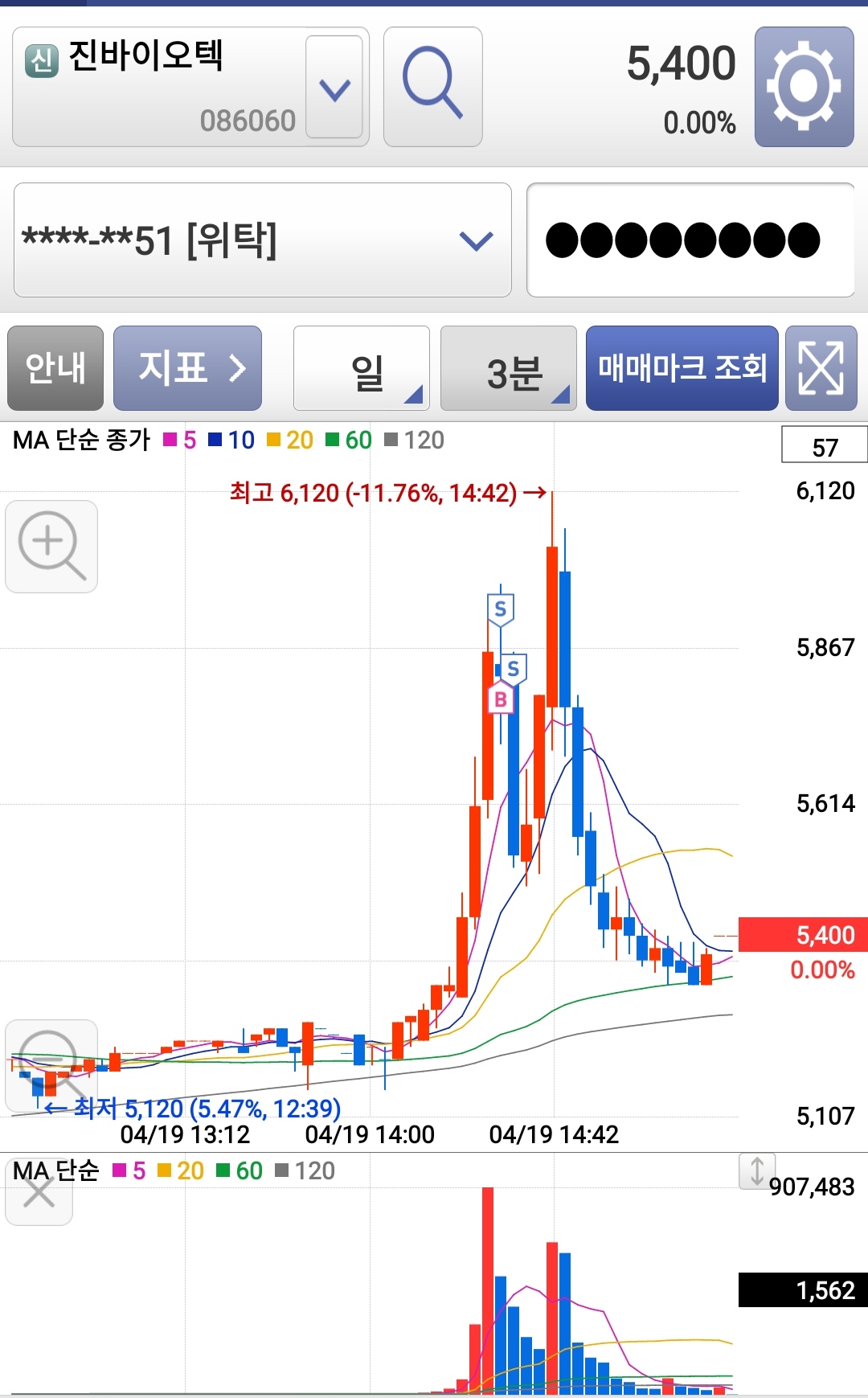 진바이오텍, 장중 단타 검색식에 떠서 기준봉 중간 진입을 목표로 진입했습니다.