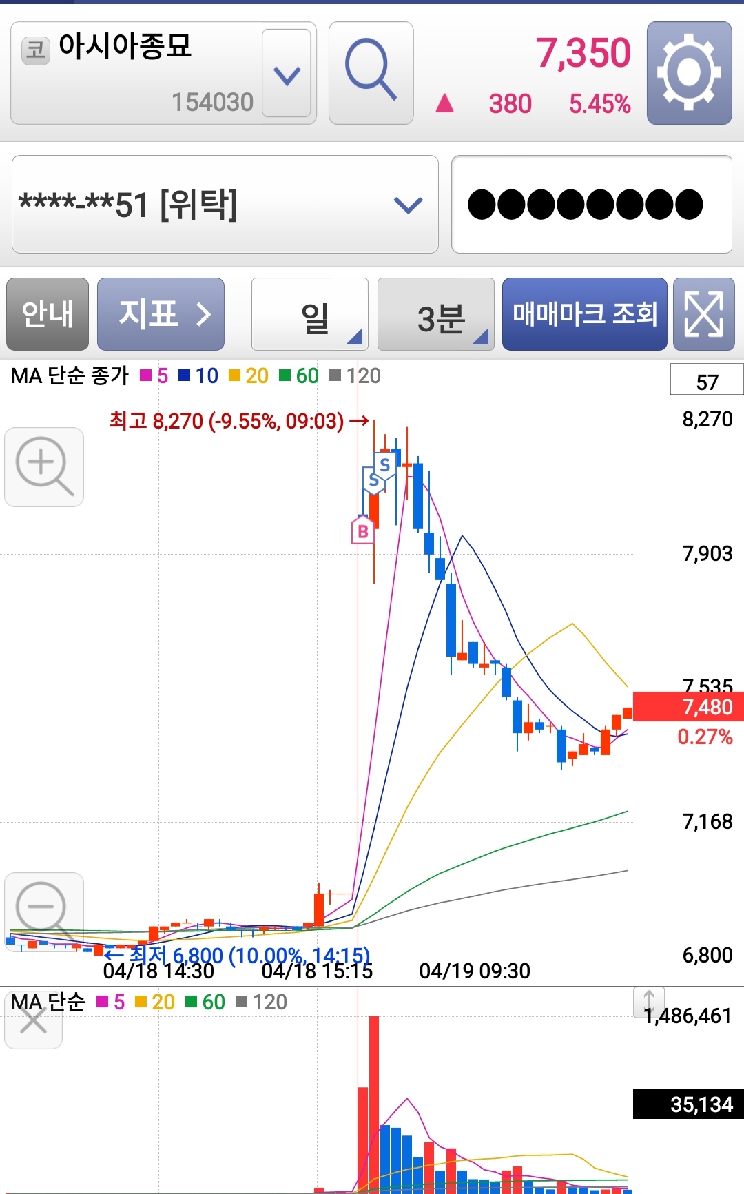 아세아종묘, 관심종목이었고, 시가배팅 들어가서 짧게 먹었네요.