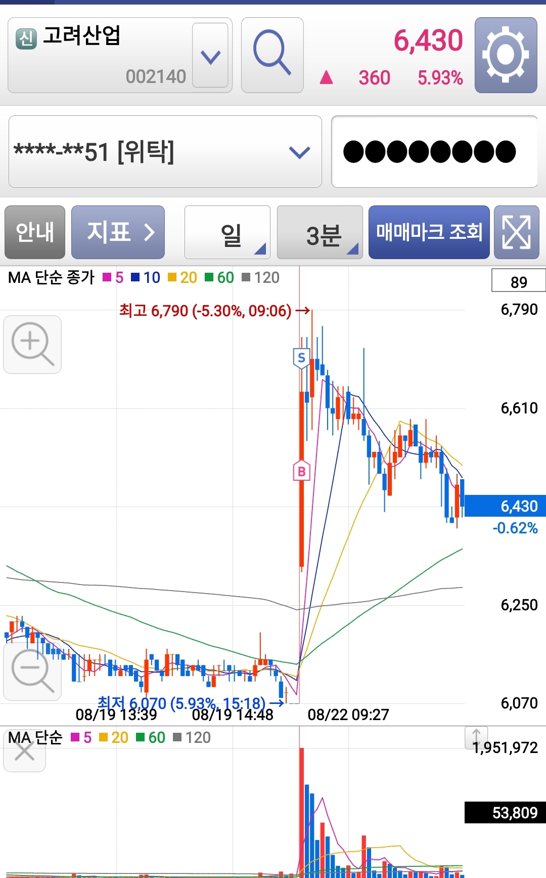 시가배팅을 진행할까 말까 고민하고 있었는데, 시초가가 좀 아쉽게 시작했다 싶었는데 금방 상단선을 뚫고 올라가더라고요. 상단선 돌파할 때 매수 들어갔습니다.