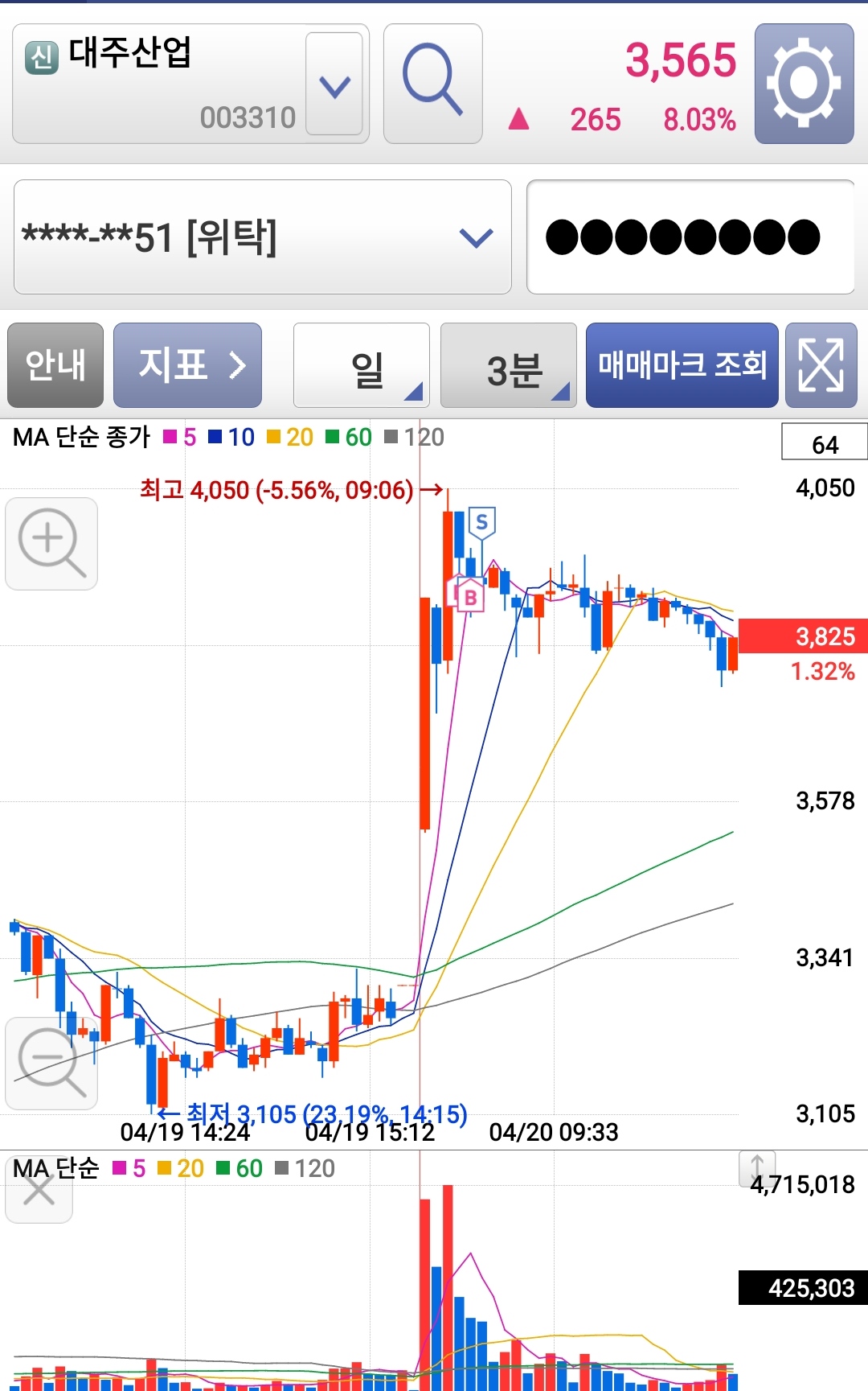 대주산업, 어제부터 기켜보던 종목이었는데 기준봉 갱신이 나와서, 새로운 기준봉 보고 진입했다.