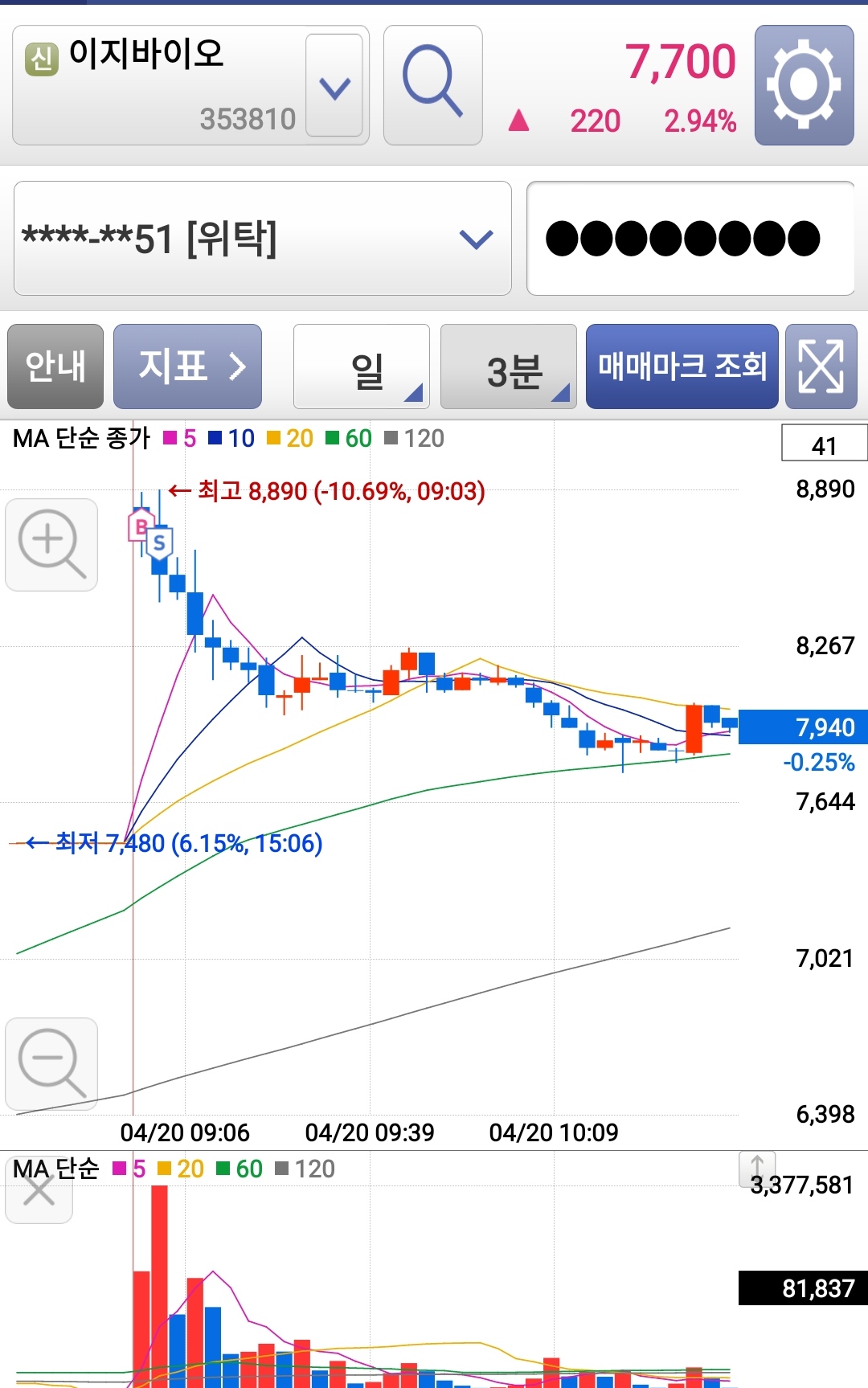 이지바이오, 관심종목이었고 시가배팅 자리가 나와서 시가에 진입.