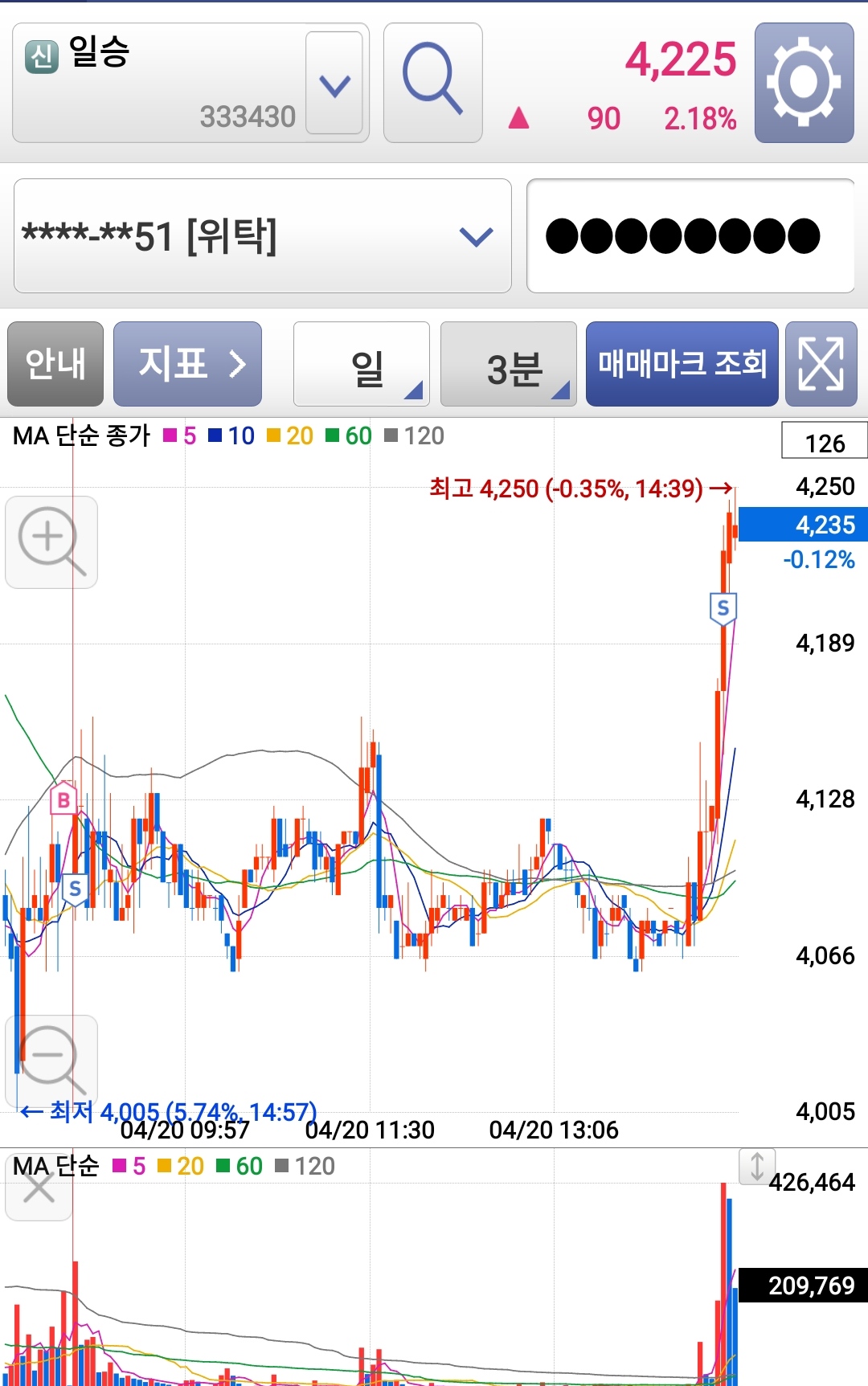 대주산업, 어제부터 기켜보던 종목이었는데 기준봉 갱신이 나와서, 새로운 기준봉 보고 진입했다.