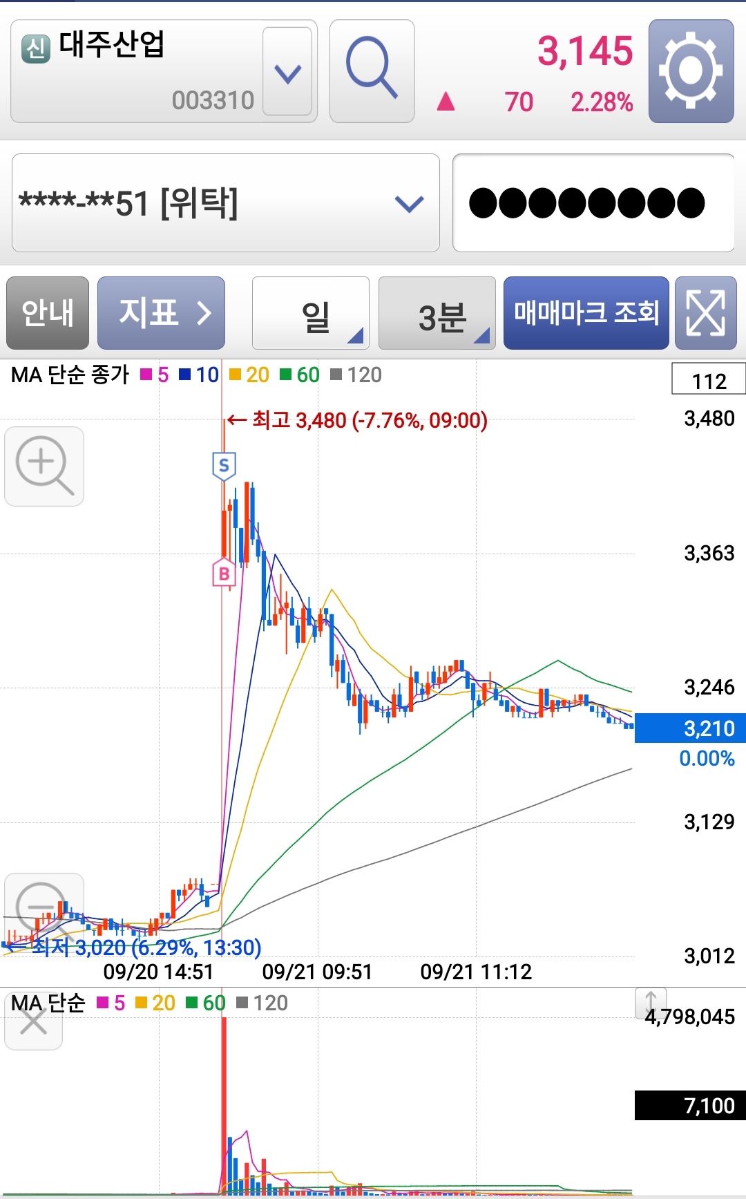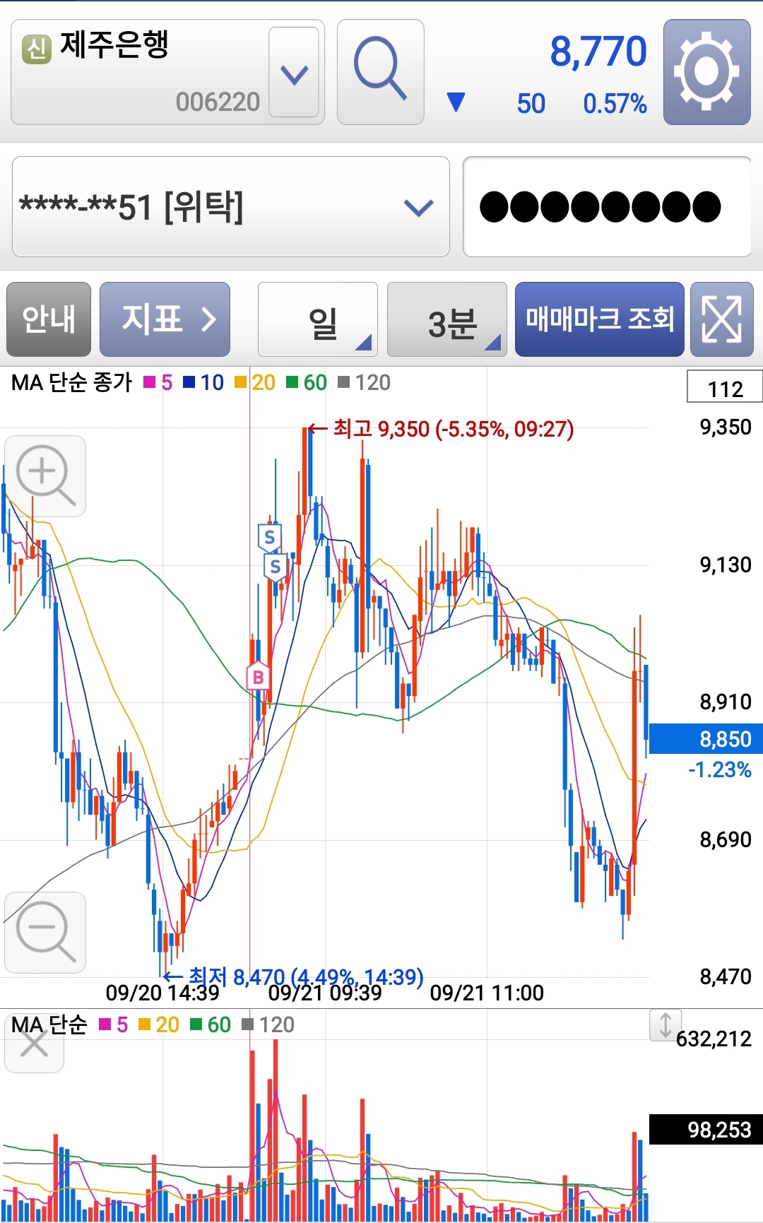 대주산업 매매가 금방 끝나서 관심종목을 보다 보니 제주은행이 괜찮아 보여서 기준봉 매매로 진입했습니다