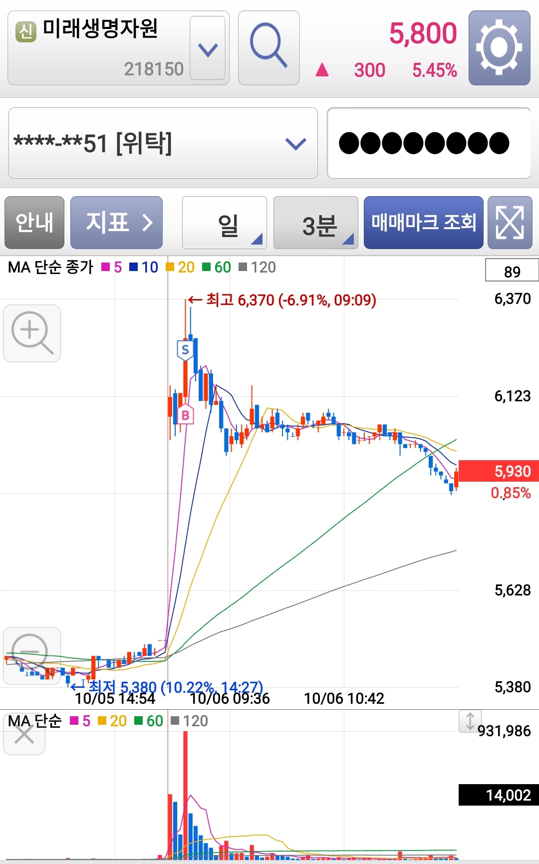 기준봉 매매 망하고, 시가 재돌파 들어갈만한 게 없나 보고 있는데, 미래생명자원이 꿈틀거려서 대기하고 있다가